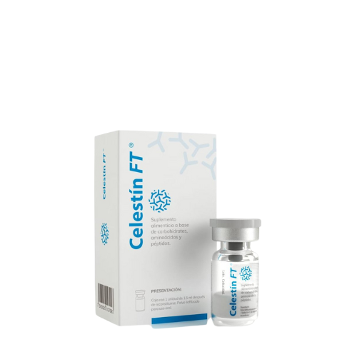 * Cada vial de Celestín FT contiene polvo liofilizado de carbohidratos, aminoácidos y péptidos (<10 kDa). Tras reconstituirse con ~1.5 mL de agua, pesa alrededor de 20 g y se utiliza por vía sublingual para fortalecer el sistema inmunológico.