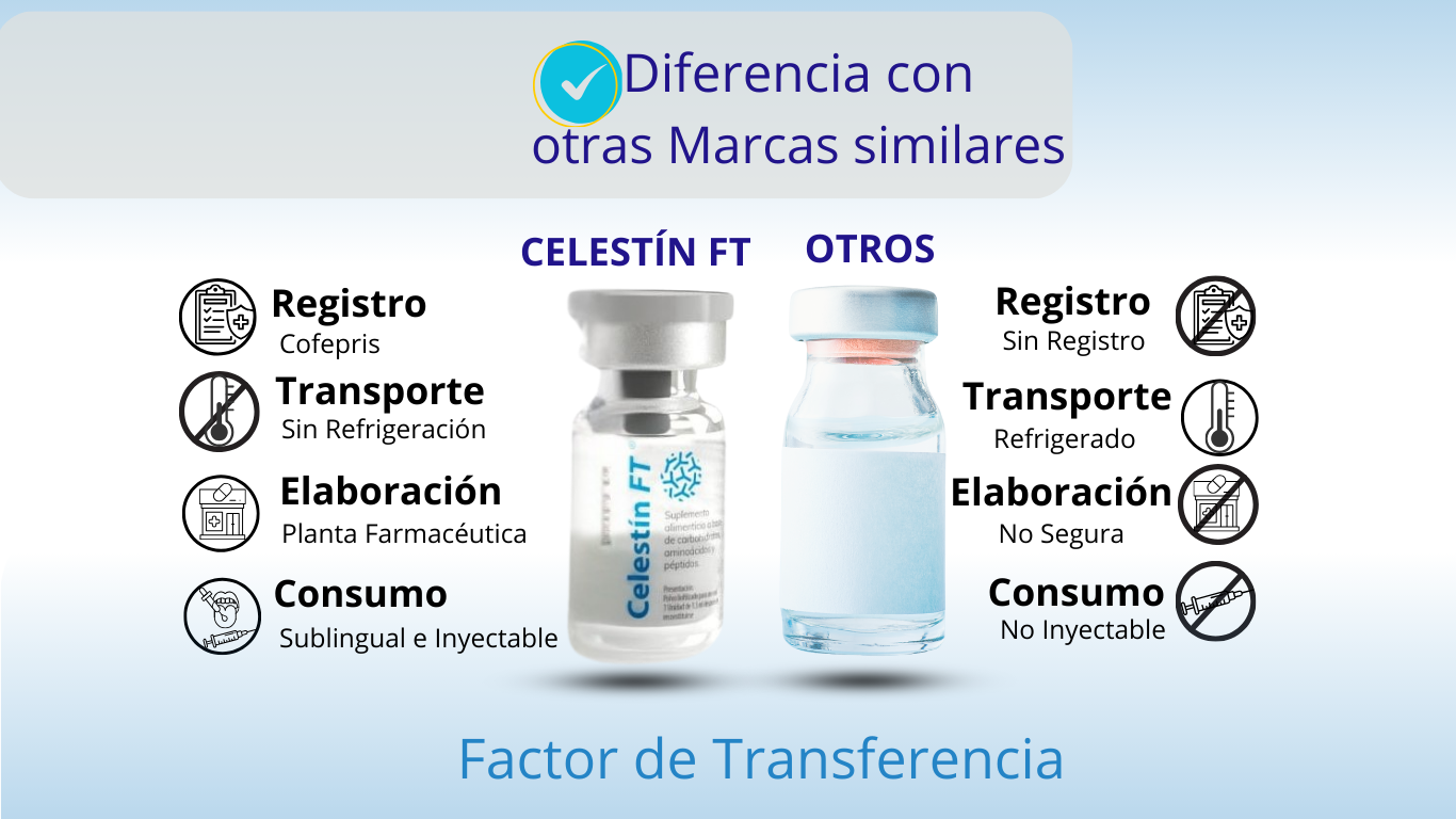 A diferencia de otros suplementos, Celestín FT cuenta con registro Cofepris, se elabora en planta farmacéutica certificada y su proceso liofilizado permite transportarlo sin refrigeración. Además, ofrece un consumo seguro tanto sublingual como inyectable, garantizando pureza, calidad y mayor efectividad.